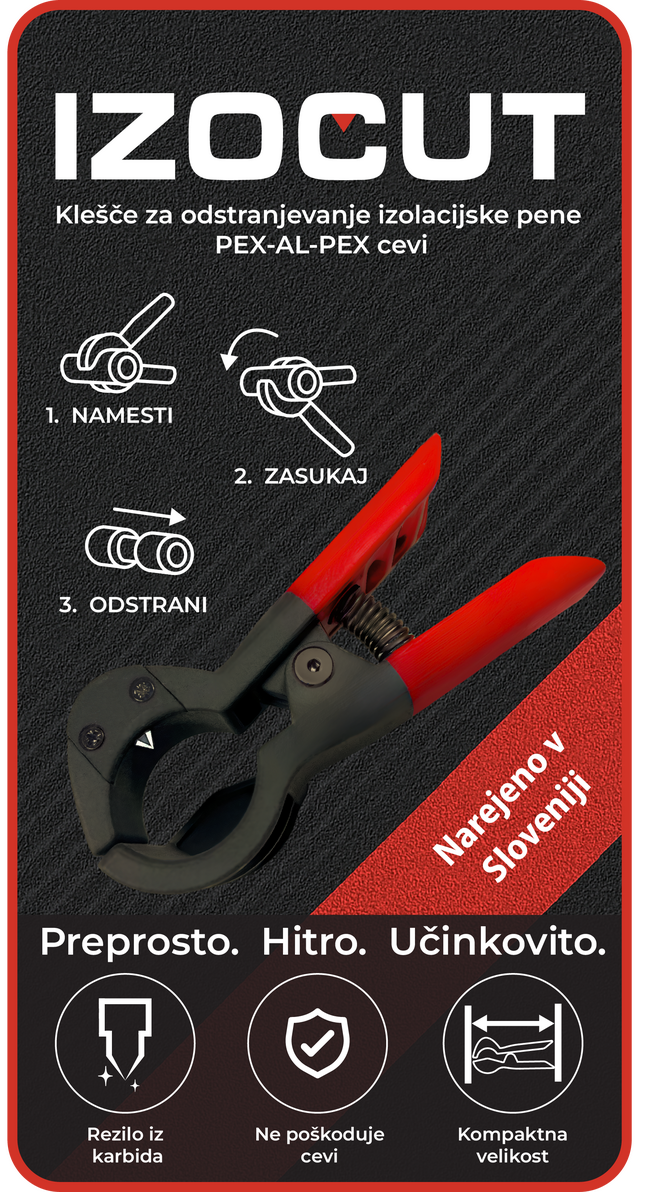 Izocut omogoča hitro, natančno in ponovljivo odstranjevanje izolacijske pene z večslojnih cevi (PEX-AL-PEX, alu-plast). Zasnova temelji na potrebah monterjev, ki pri vsakodnevnem delu zahtevajo zanesljivo, ponovljivo in hitro rešitev, brez tveganja za poškodbe cevi.Zahvaljujoč izjemno trpežnemu, zamenljivemu karbidnemu rezilu in posebej zasnovani glavi z vodilnim sedlom, orodje izolacijo reže čisto in brez poškodb cevi.Vgrajen nastavitveni omejevalnik (stoper) zagotavlja enakomerno dolžino odrezane izolacije pri vsakem rezu, medtem ko kompaktna oblika omogoča uporabo tudi v ozkih in težko dostopnih mestih.Robustno ogrodje, ojačano s steklenimi vlakni zagotavlja dolgo življenjsko dobo ter zanesljivo delovanje v vsakodnevni profesionalni uporabi.